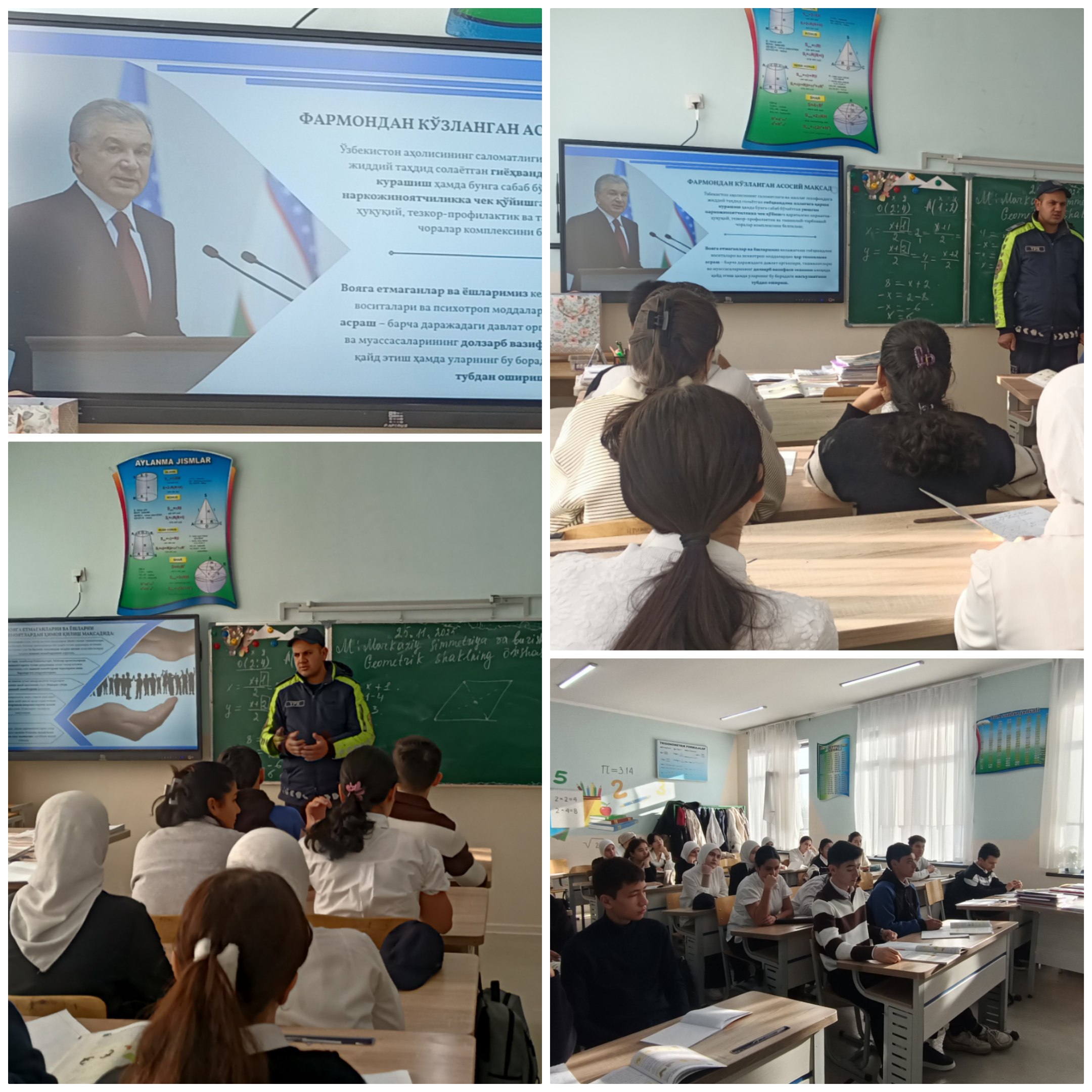 15.11.2025 9-10-11-sinf o’quvchilariga "Aholi salomatligi va millat genofondini giyohvandlik va narkojinoyatlardan samarali himoya qilish haqida o'quvchilarga yetkazildi